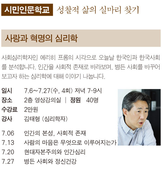 사회심리학자인 에리히 프롬의 시각으로 오늘날 한국인과 한국사회를 분석합니다. 인간을 사회적 존재로 바라보며, 병든 사회를 바꾸어 보고자 하는 심리학에 대해 이야기 나눕니다.