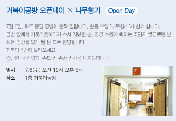 7월 6일, 하루 종일 공방이 활짝 열립니다. 활동 모임 ‘나무향기’가 함께 합니다.공방 앞에서 기웃기웃하다가 스쳐 지났던 분, 쿵쿵 소음에 뭐하는 곳인지 궁금했던 분,처음 공방을 알게 된 분 모두 환영합니다.거북이공방에 놀러오세요.간단한 나무 깎기, 손도구, 손공구 사용이 가능합니다.