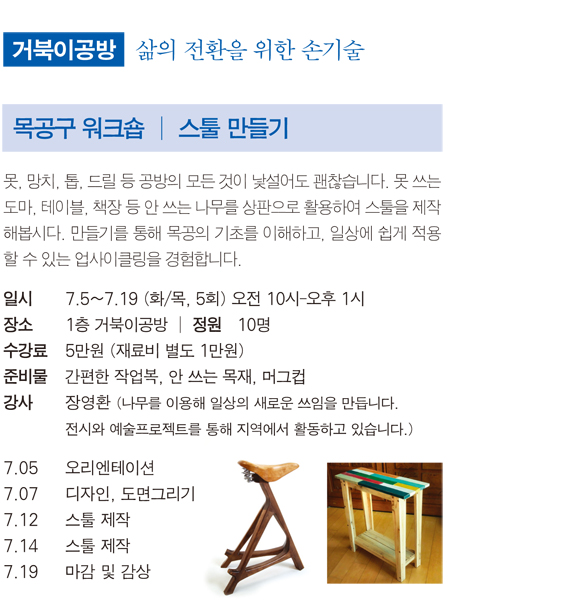 못, 망치, 톱, 드릴 등 공방의 모든 것이 낯설어도 괜찮습니다. 못 쓰는 도마, 테이블, 책장 등 안 쓰는 나무를 상판으로 활용하여 스툴을 제작해봅시다. 만들기를 통해 목공의 기초를 이해하고, 일상에 쉽게 적용할 수 있는 업사이클링을 경험합니다.