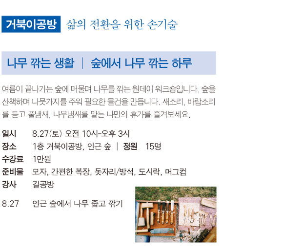 여름이 끝나가는 숲에 머물며 나무를 깎는 원데이 워크숍입니다. 숲을 산책하며 나뭇가지를 주워 필요한 물건을 만듭니다. 새소리, 바람소리를 듣고 풀냄새, 나무냄새를 맡는 나만의 휴가를 즐겨보세요.
