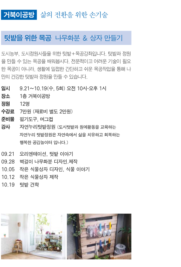 도시농부, 도시정원사들을 위한 텃밭+목공강좌입니다. 텃밭과 정원을 만들 수 있는 목공을 배워봅시다. 전문적이고 어려운 기술이 필요한 목공이 아니라, 생활에 밀접한 간단하고 쉬운 목공작업을 통해 나만의 건강한 텃밭과 정원을 만들 수 있습니다.