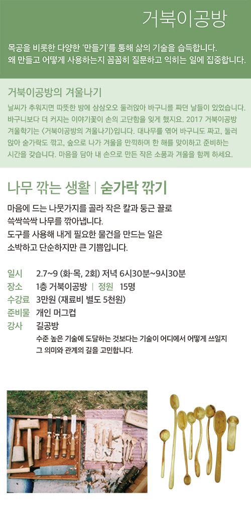 마음에 드는 나뭇가지를 골라 작은 칼과 둥근 끌로 쓱싹쓱싹 나무를 깎아냅니다. 도구를 사용해 내게 필요한 물건을 만드는 일은 소박하고 단순하지만 큰 기쁨입니다.