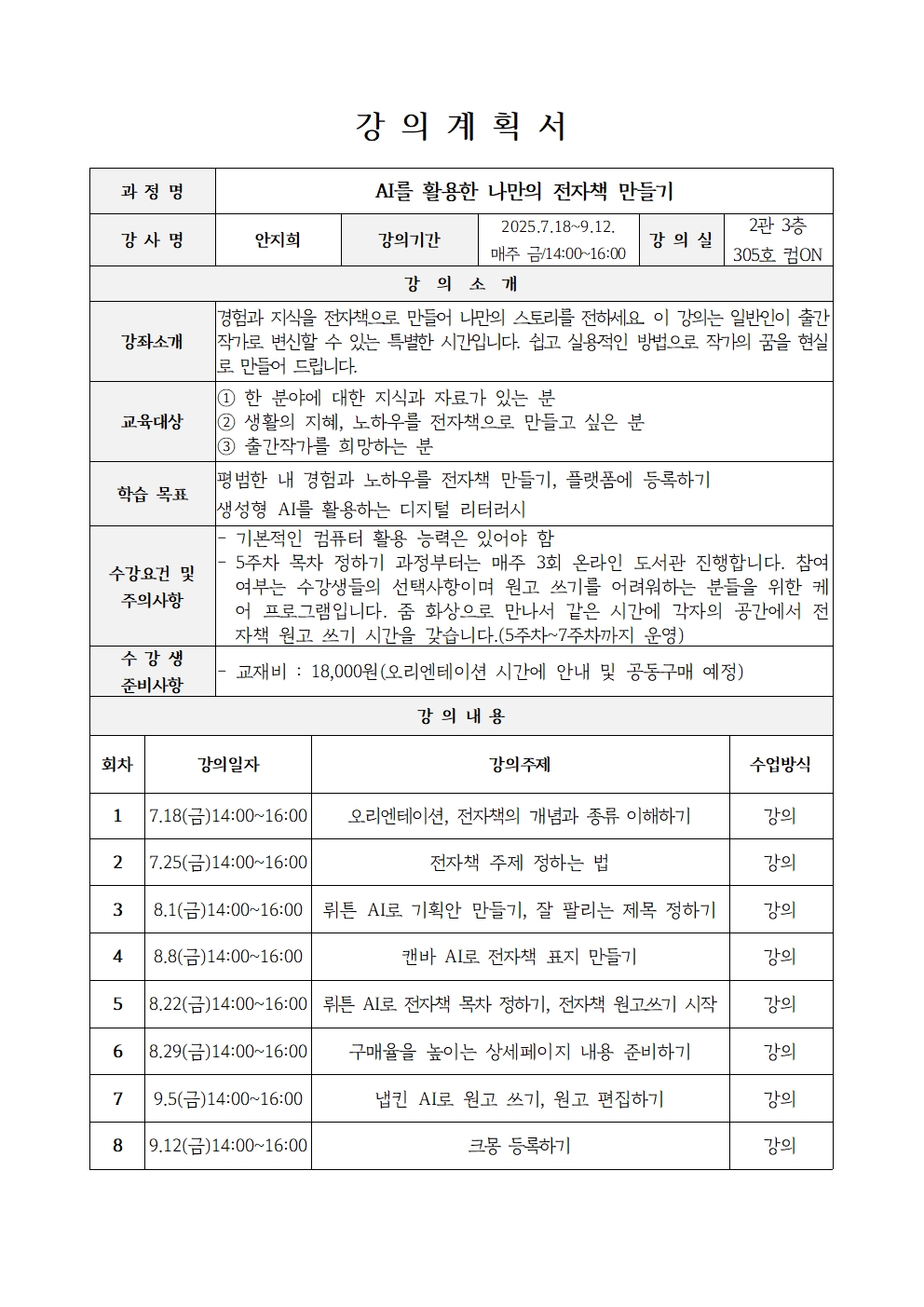 ■ 강의기간 : 25.7.18.~9.12. / 매주 금 총8회