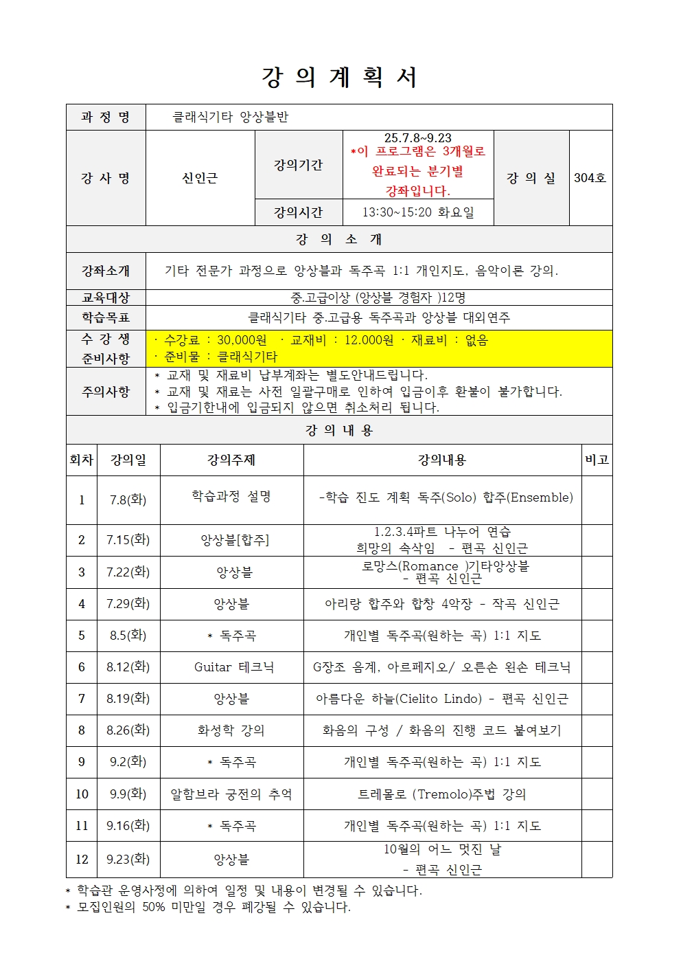 수업 중간 참여는 3회차 까지만 대기자 접수 순으로 받고 있습니다. 중도에 신청하셔도 수강료 및 교재비, 재료비는 처음과 동일합니다.
