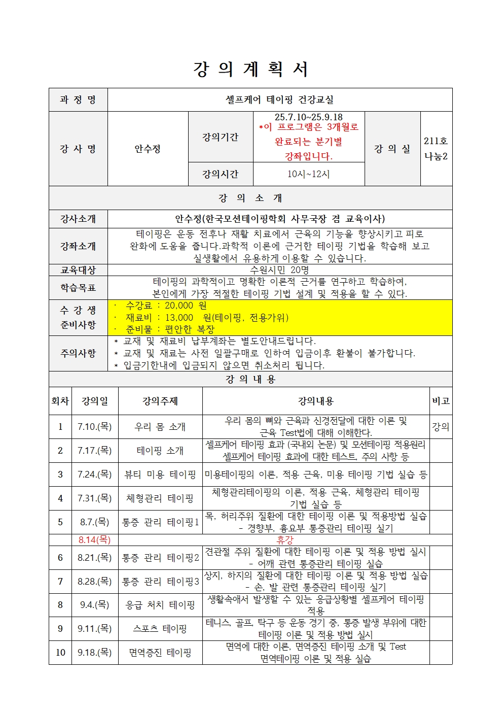 수업 중간 참여는 3회차 까지만 대기자 접수 순으로 받고 있습니다. 중도에 신청하셔도 수강료 및 교재비, 재료비는 처음과 동일합니다.