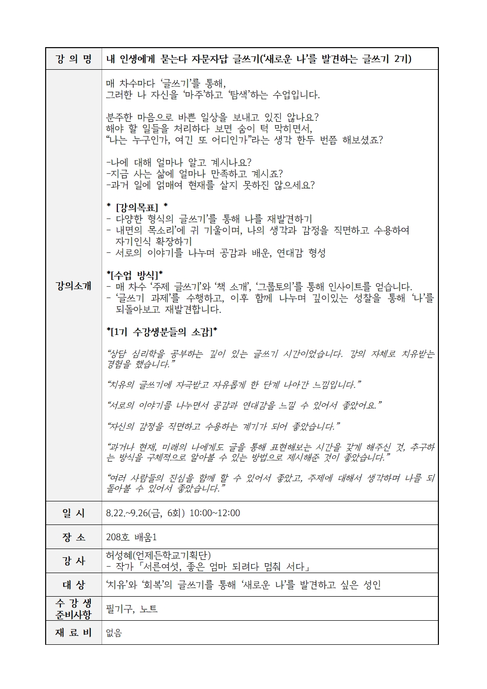 [언제든학교]내 인생에게 묻는다 자문자답 글쓰기(새로운 나를 발견하는 글쓰기 2기)