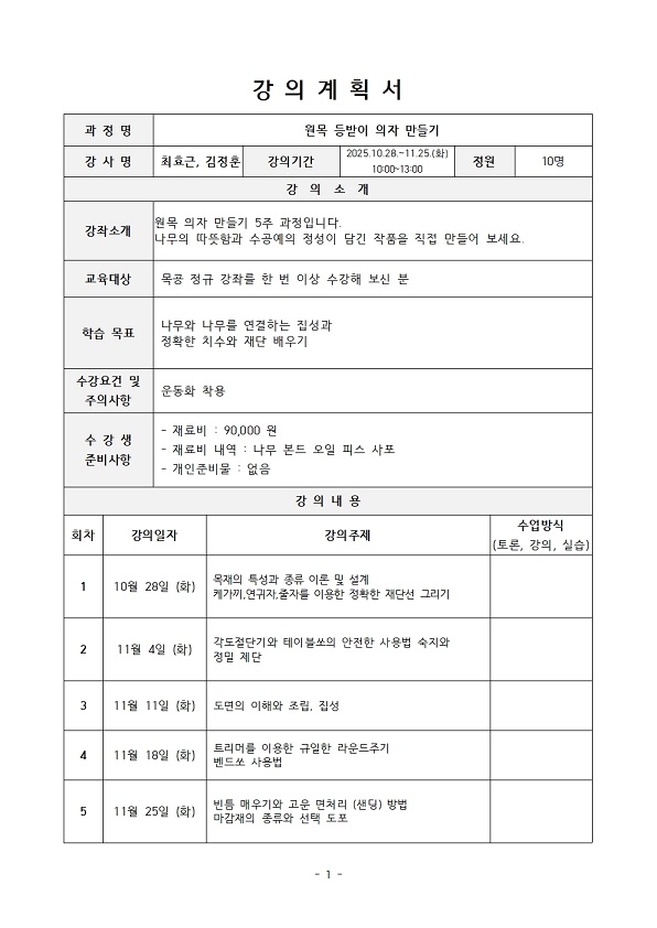 원목 가구 제작의 기초를 다지고 견고한 기술을 배워보세요.