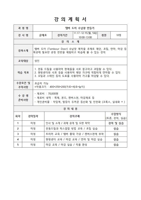 탬버도어 수납장 제작을 주제로 재단, 조립, 연마, 마감 등 목공에 필요한 공정 전반을 체험하고 학습해 볼 수 있습니다.