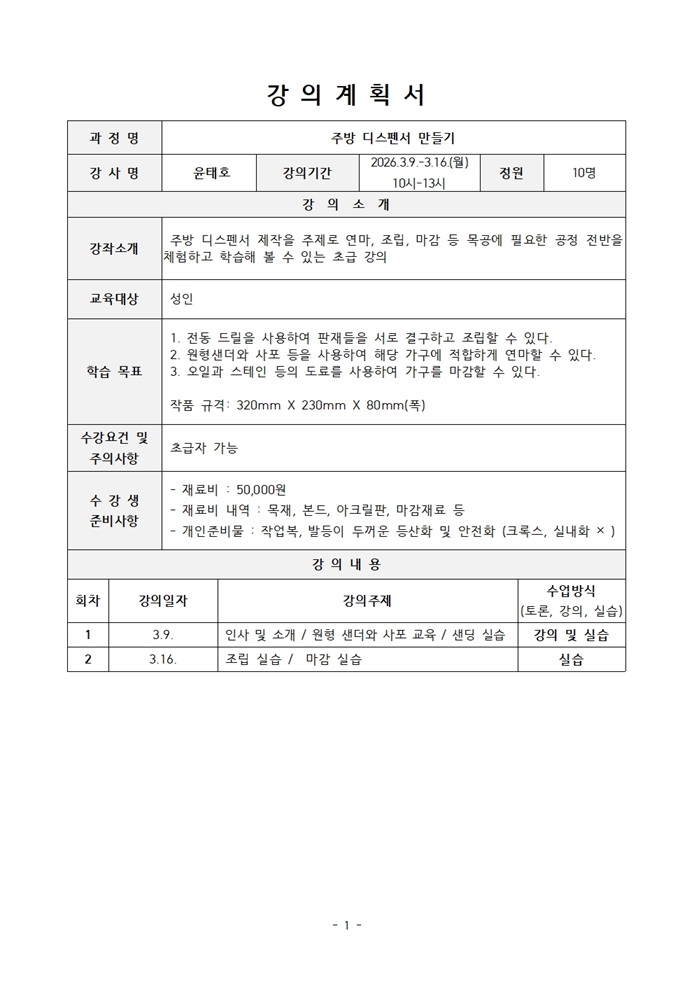 ■ 수강료/재료비 : 1만원/5만원