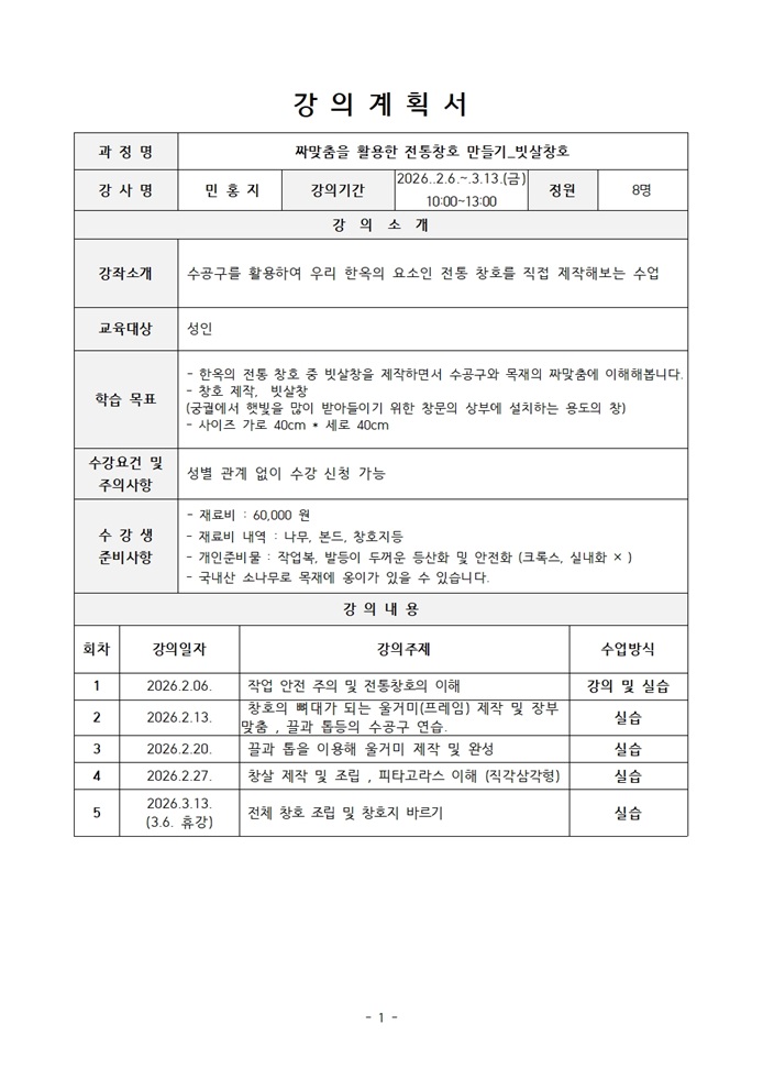 문화재 수리·복원 전문 강사님과 함께 전통 창호를 만들어 보고 수공구와 목재의 짜맞춤에 대해 이해해봅니다.