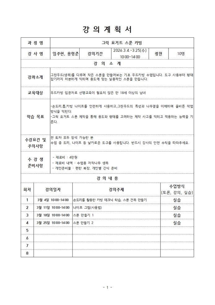 도구 사용부터 형태 잡기까지 차분하게 익히며 용도에 맞는 실용적인 스푼을 만듭니다.