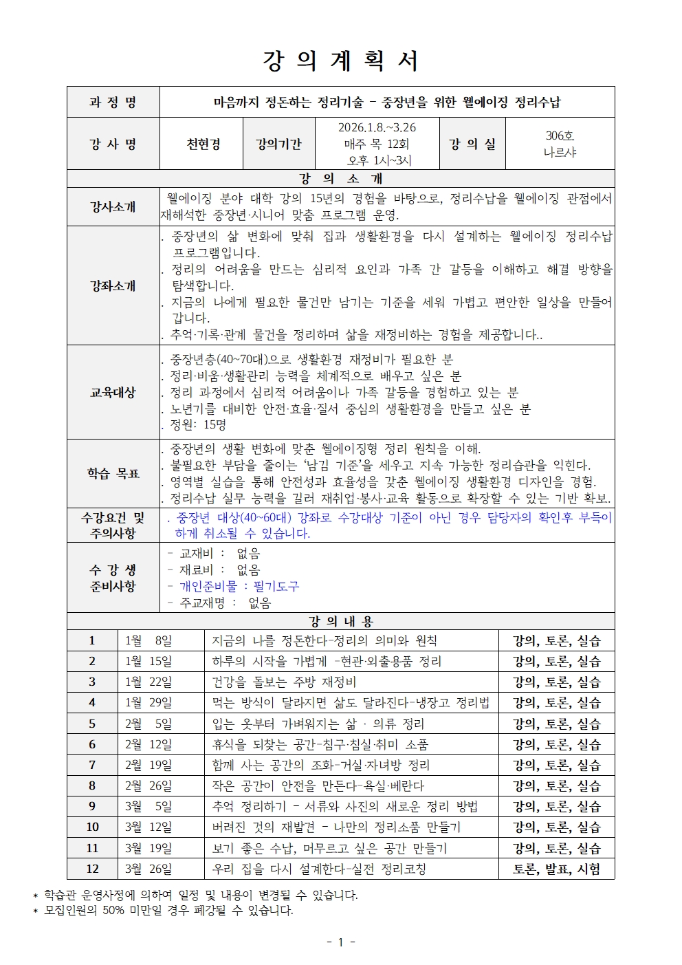 마음까지 정돈하는 정리기술 – 중장년을 위한 웰에이징 정리수납_26년 1분기