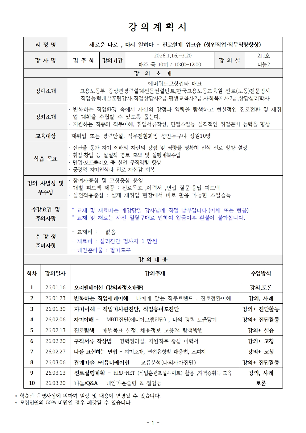 새로운 나로 , 다시 일하다 - 진로설계 워크숍 (성인직업·직무역량향상)_26년 1분기