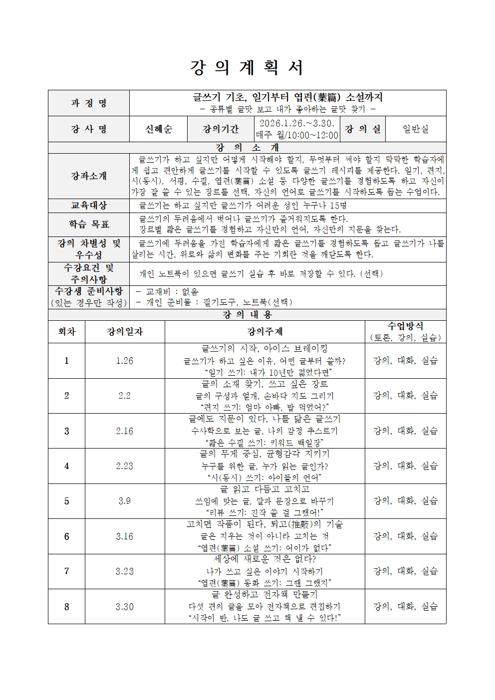 : 1.26.~3.30.(월,8회) 오전10-12시