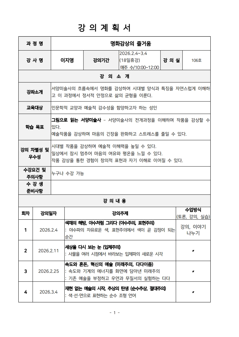 : 2.4.~3.4.(수,4회/2.18휴강) 10:00~12:00