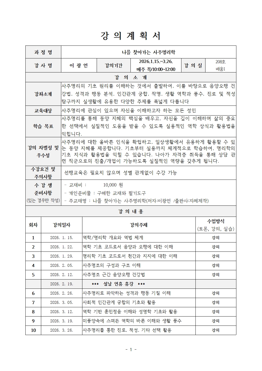 일시 : 1.15.~3.26.(목,10회) 오전10-12시