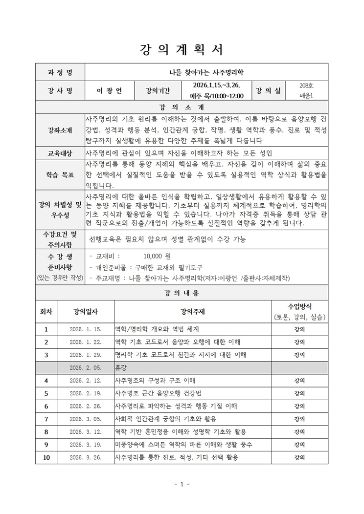 : 1.15.~3.26.(목,10회) 오전10-12시