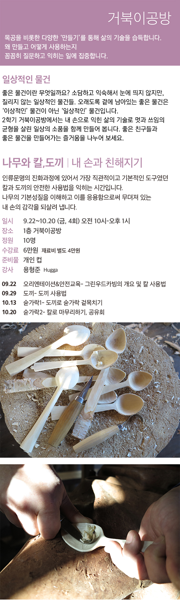 인류문명의 진화과정에 있어서 가장 직관적이고 기본적인 도구였던 칼과 도끼의 안전한 사용법을 익히는 시간입니다. 나무의 기본성질을 이해하고 이를 응용함으로써 무뎌져 있는 내 손의 감각을 되살려 냅니다.