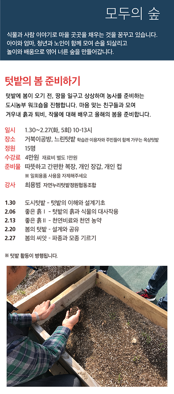 텃밭에 봄이 오기 전, 땅을 일구고 상상하며 농사를 준비하는 도시농부 워크숍을 진행합니다. 마음 맞는 친구들과 모여 겨우내 흙과 퇴비, 작물에 대해 배우고 올해의 봄을 준비합니다.