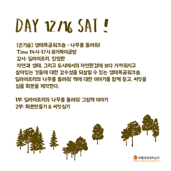 일시: 12.16(토) 14:00-17:00강사: 딜라이트리, 장영환수강료: 무료 (재료비 별도 2만원-나무를 돌려줘 그림책 포함)정원: 10명 * 성인 참가시 자녀 2인 동반 가능합니다.