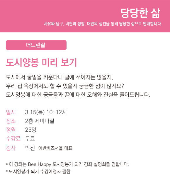 도시양봉 미리보기도시에서 꿀벌을 키운다니 벌에 쏘이지는 않을지, 우리 집 옥상에서도 할 수 있을지 궁금한 점이 많지요? 도시양봉에 대한 궁금증과 꿀에 대한 오해와 진실을 풀어드립니다. * 이 강좌는 Bee Happy 도시양봉가 되기 강좌 설명회를 겸합니다.