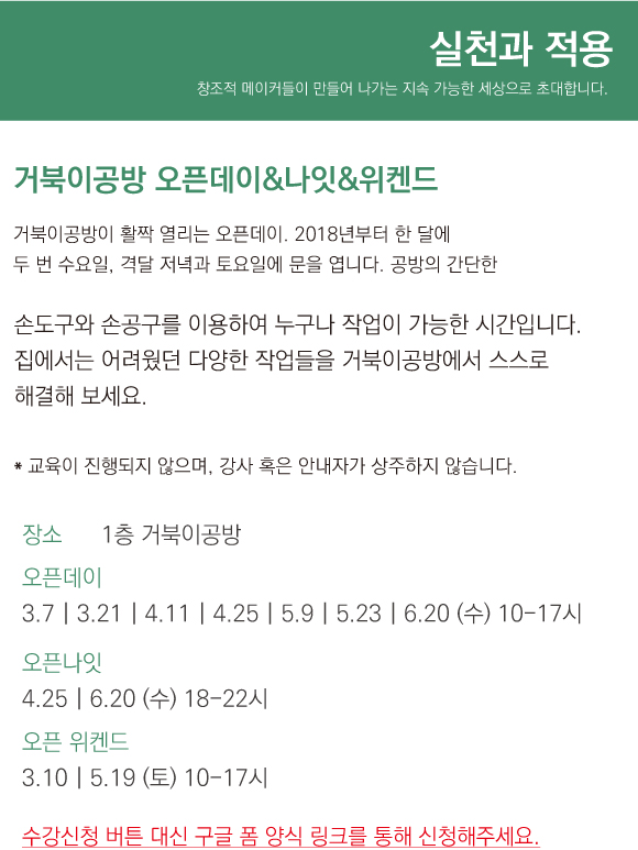 거북이공방이 활짝 열리는 오픈데이. 한 달에 두 번 공방의 간단한 손도구와 손공구를 이용하여 누구나 작업이 가능한 시간입니다. 집에서는 어려웠던 다양한 작업들을 거북이공방에서 스스로 해결해 보세요.