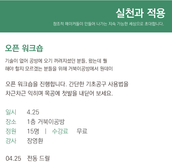 기술이 없어 공방에 오기 꺼려지셨던 분들, 왔는데 뭘 해야 할지 모르겠는 분들을 위해 거북이공방에서 원데이 오픈 워크숍을 진행합니다. 간단한 기초공구 사용법을 차근차근 익히며 목공에 첫발을 내딛어 보세요.