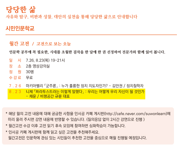 *해당 월의 고전 내용에 대해 궁금한 사항을 인사공 카페 게시판(http://cafe.naver.com/suwonlearn)에 미리 올려 주시면 강연 내용에 반영할 수 있습니다. (질의응답 없이 2시간 강연으로 진행)