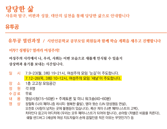 일시: 7.12~26(목, 3회) 10-12시 여성주의 모임 ‘새날’이 주도합니다.