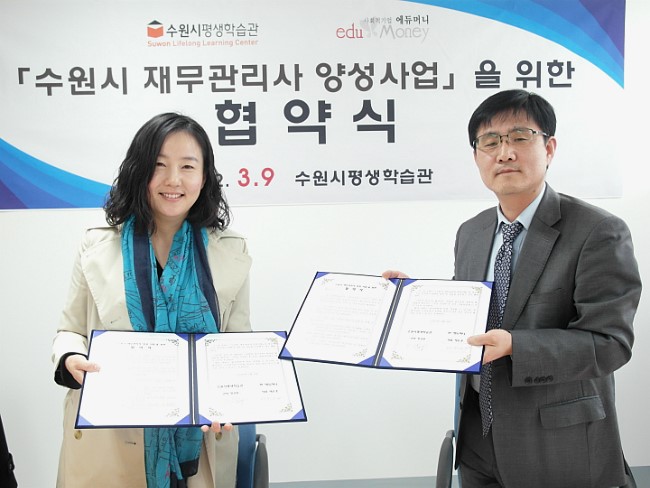 1. 39일 오후2, <수원시평생학습관>과 사회적 기업 <에듀머니><수원시 재무관리사 양성사업>을 위한 협약을 맺고 지역의 재무관리 전문가 양성 및 일자리창출을 위한 공동사업을 추진한다.