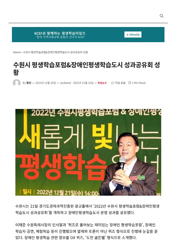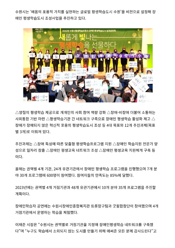 [평생학습타임즈] 수원시 평생학습포럼 및 장애인평생학습도시 성과공유회 성황