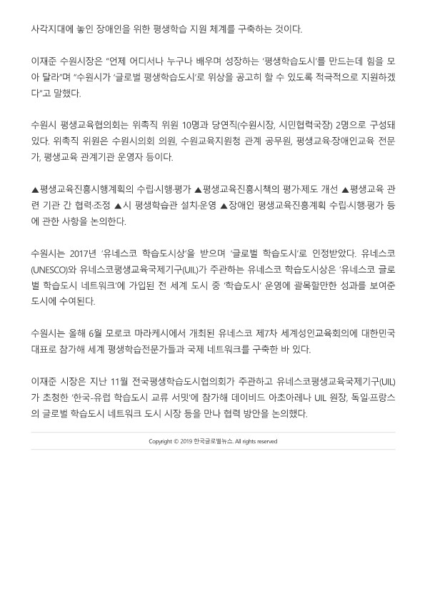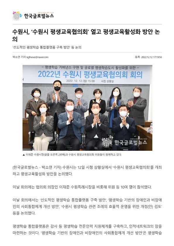 [한국글로벌뉴스] 수원시 ‘수원시 평생교육협의회’ 열고 평생교육활성화 방안 논의