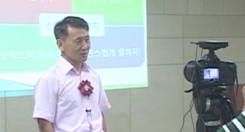 기자는 제작 PD의 질문에 “매탄4동에서 실시하는 누구나 학습마을 ‘마을신문 만들기’ 강의를 수강하던 중 누구나 학습마을은 이름 그대로 누구나 강사가 될 수 있다는 말에 강의개설을 신청했다. 강의 프로그램은 발음 교정을 위해 몇 년 전에 수강했던 리더쉽 스피치 강좌를 ‘주민 스피치’라는 이름으로 5주째 진행 하면서 강사에 대한 자신감을 갖게 되었다.”고 말했다.