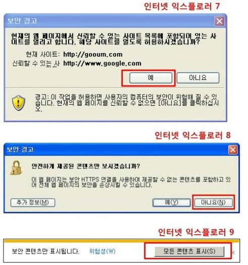 - 인터넷 사용환경(7, 8, 9버전)에 따라 보안경고 설정방식이 다름