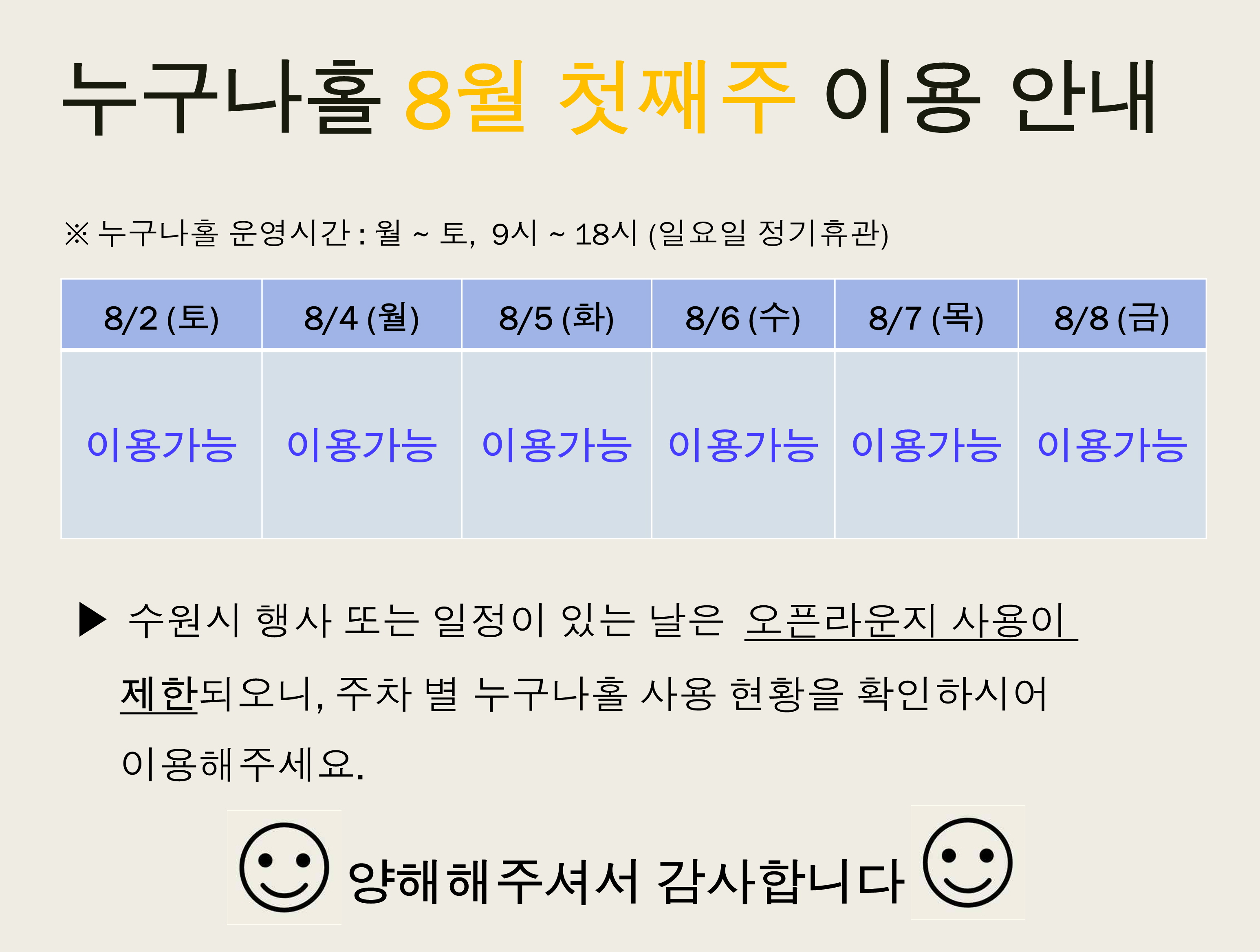 수원시 평생학습관 '누구나홀'의 7월 둘째주 이용 시간을 안내드립니다.