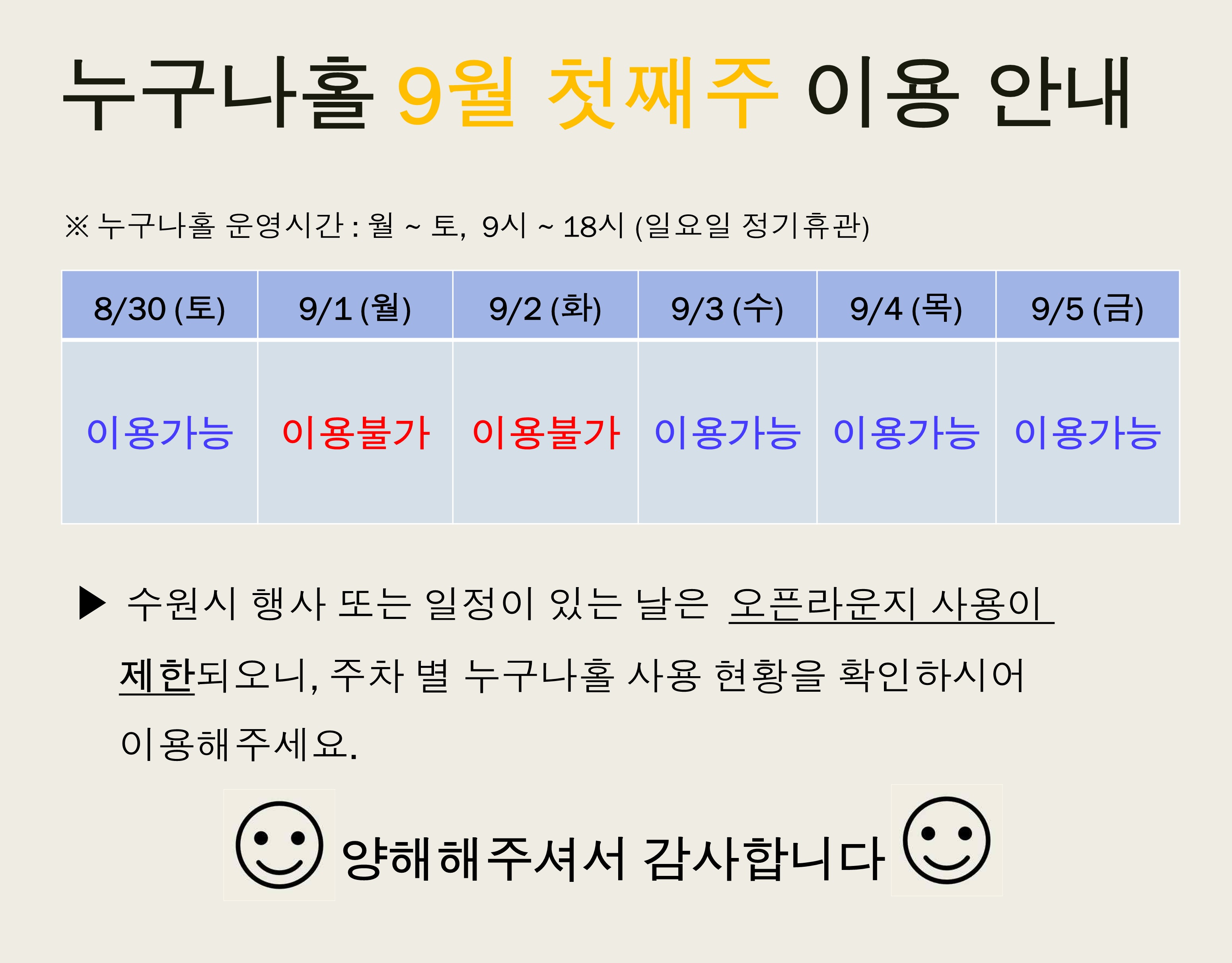 수원시 평생학습관 '누구나홀'의 9월 첫째주 이용 시간을 안내드립니다.