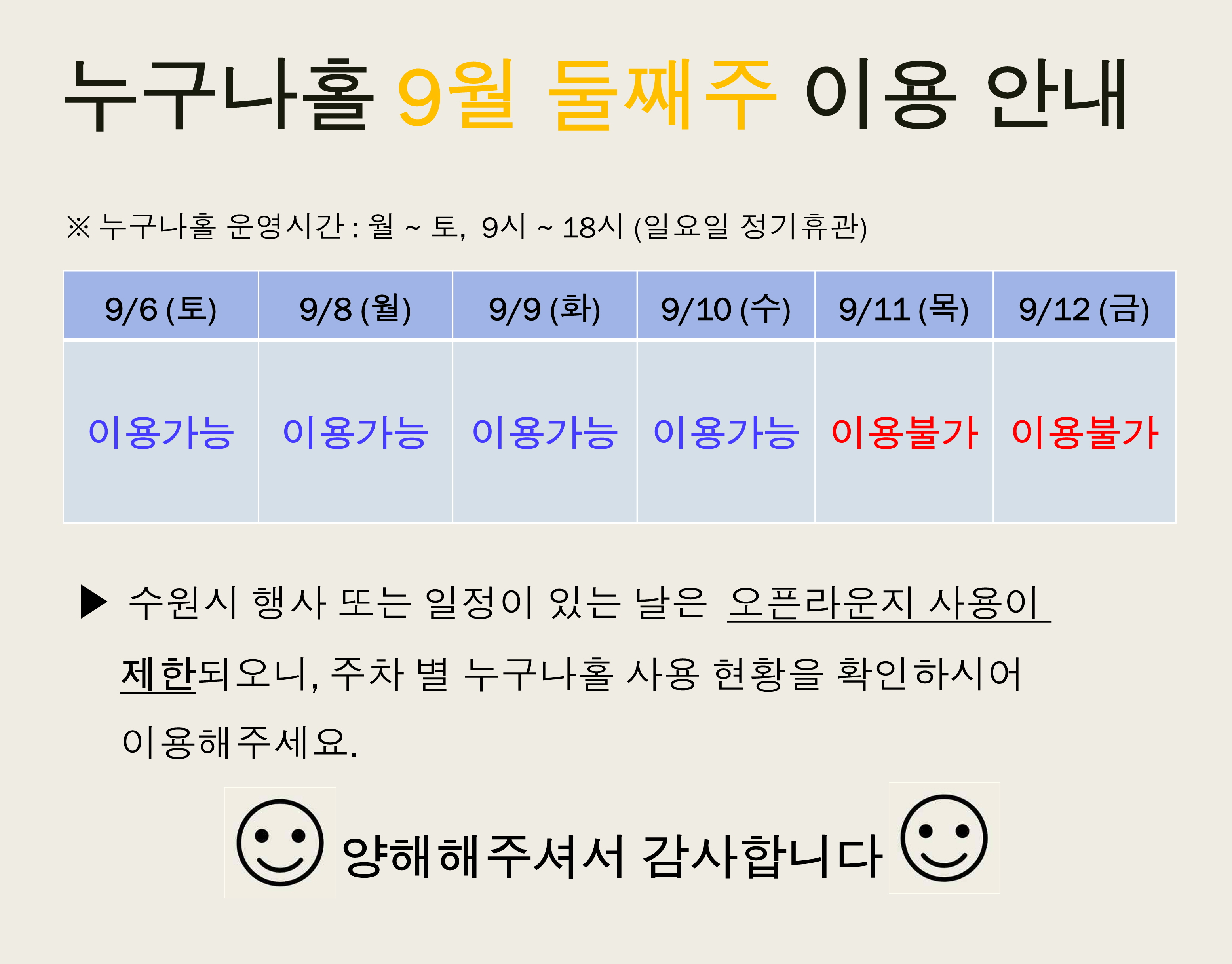 수원시 평생학습관 '누구나홀'의 9월 둘째주 이용 시간을 안내드립니다.