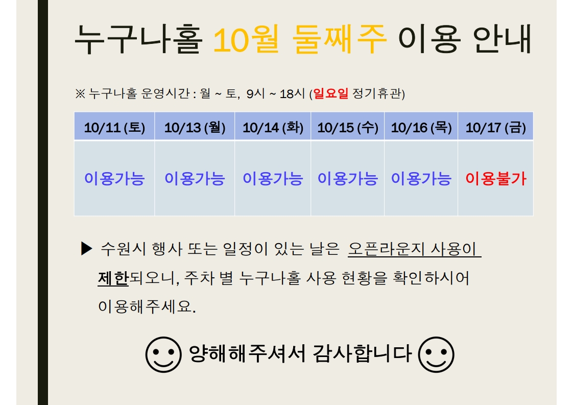 수원시 평생학습관 '누구나홀'의 10월 둘째주 이용 시간을 안내드립니다.