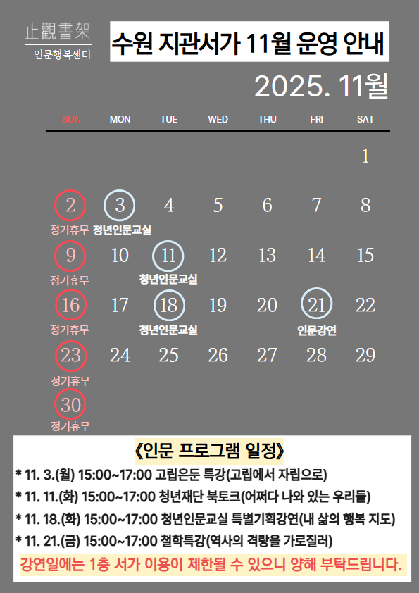 * 인문강연일에는 1층 서가 이용이 제한될 수 있으니 양해부탁드립니다.