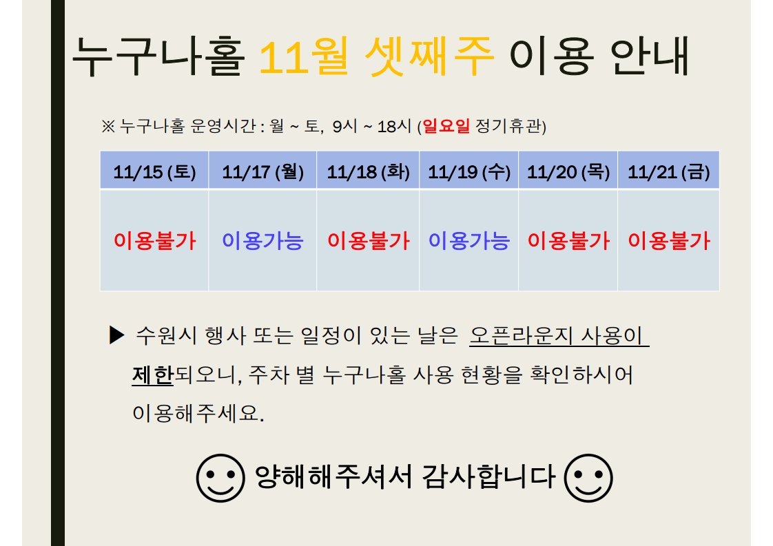 수원시 평생학습관 '누구나홀'의 11월 셋째주 이용 안내드립니다.