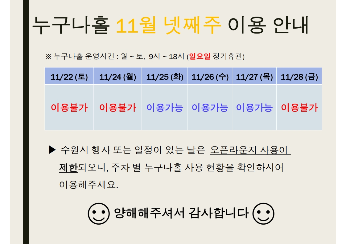 수원시 평생학습관 '누구나홀'의 11월 넷째주 이용 안내드립니다.