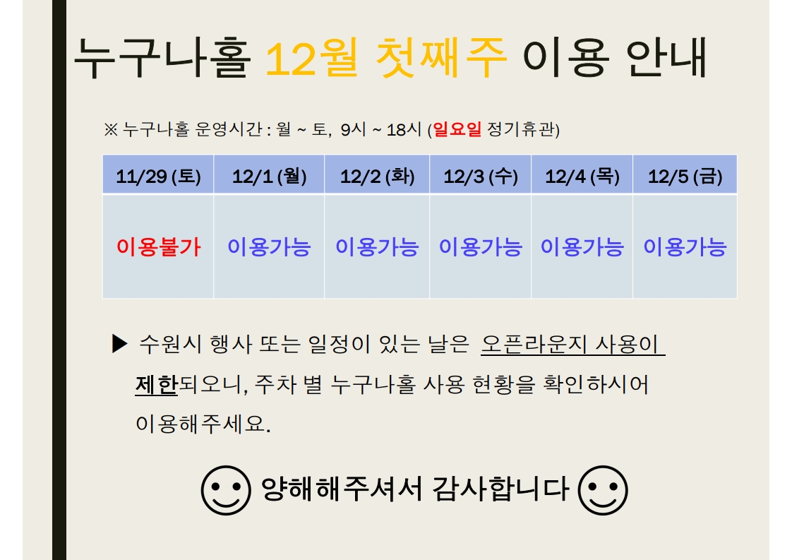 수원시 평생학습관 '누구나홀'의 12월 첫째주 이용 안내드립니다.