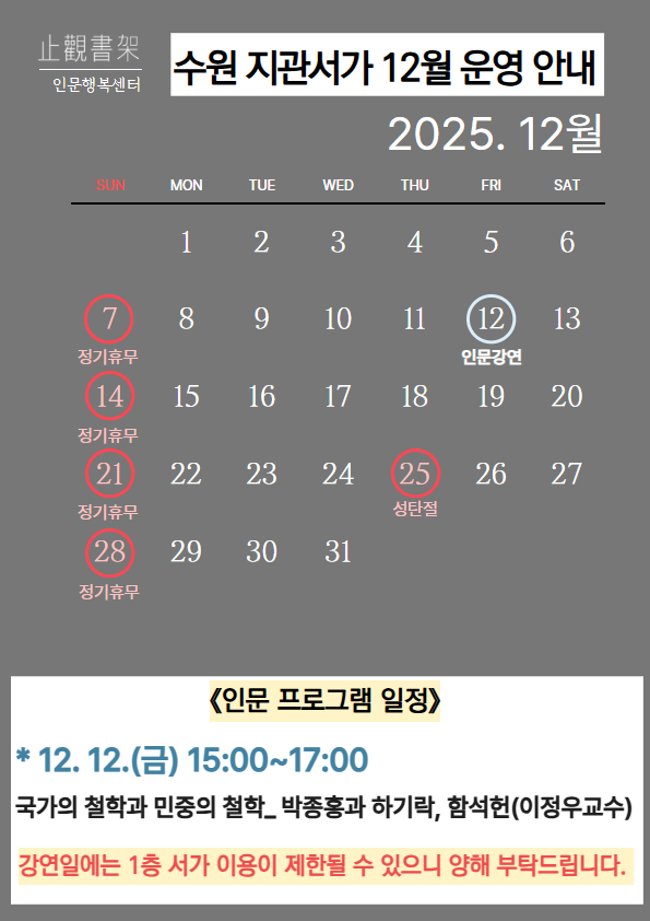 * 인문강연일에는 1층 서가 이용이 제한될 수 있으니 양해부탁드립니다.