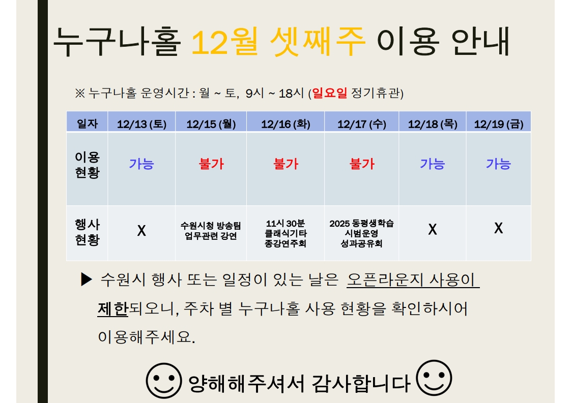 수원시 평생학습관 '누구나홀'의 12월 셋째주 이용 안내드립니다.