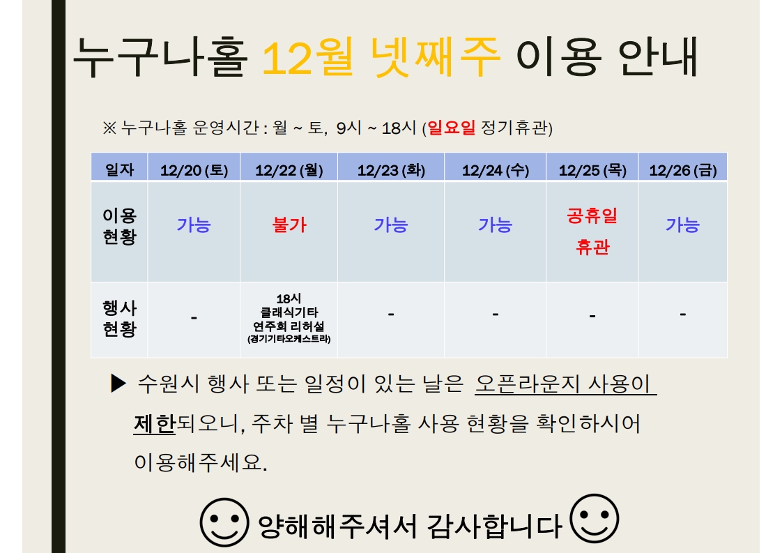 수원시 평생학습관 '누구나홀'의 12월 넷째주 이용 안내드립니다.