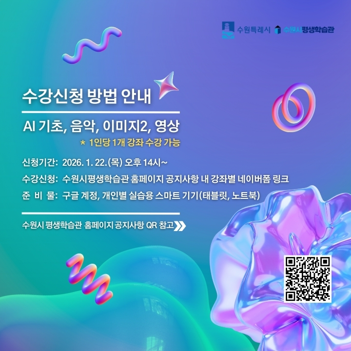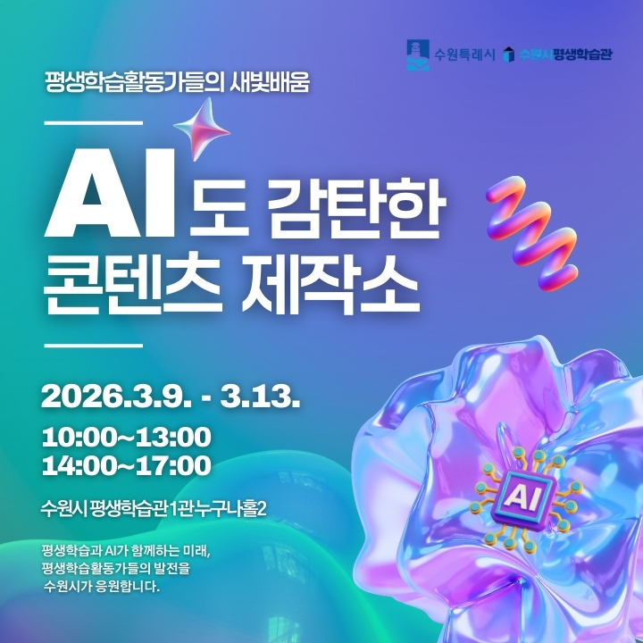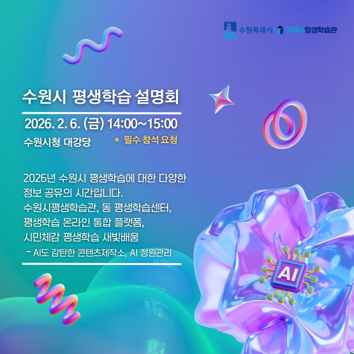 평생학습 시민 설명회를 통해서 2026년 수원시 평생학습(동 평생학습센터, 수원시평생학습관 등)에 자세한 관련 내용을 안내하는 시간을 가질 예정이니, 많은 관심과 참여 부탁드립니다.