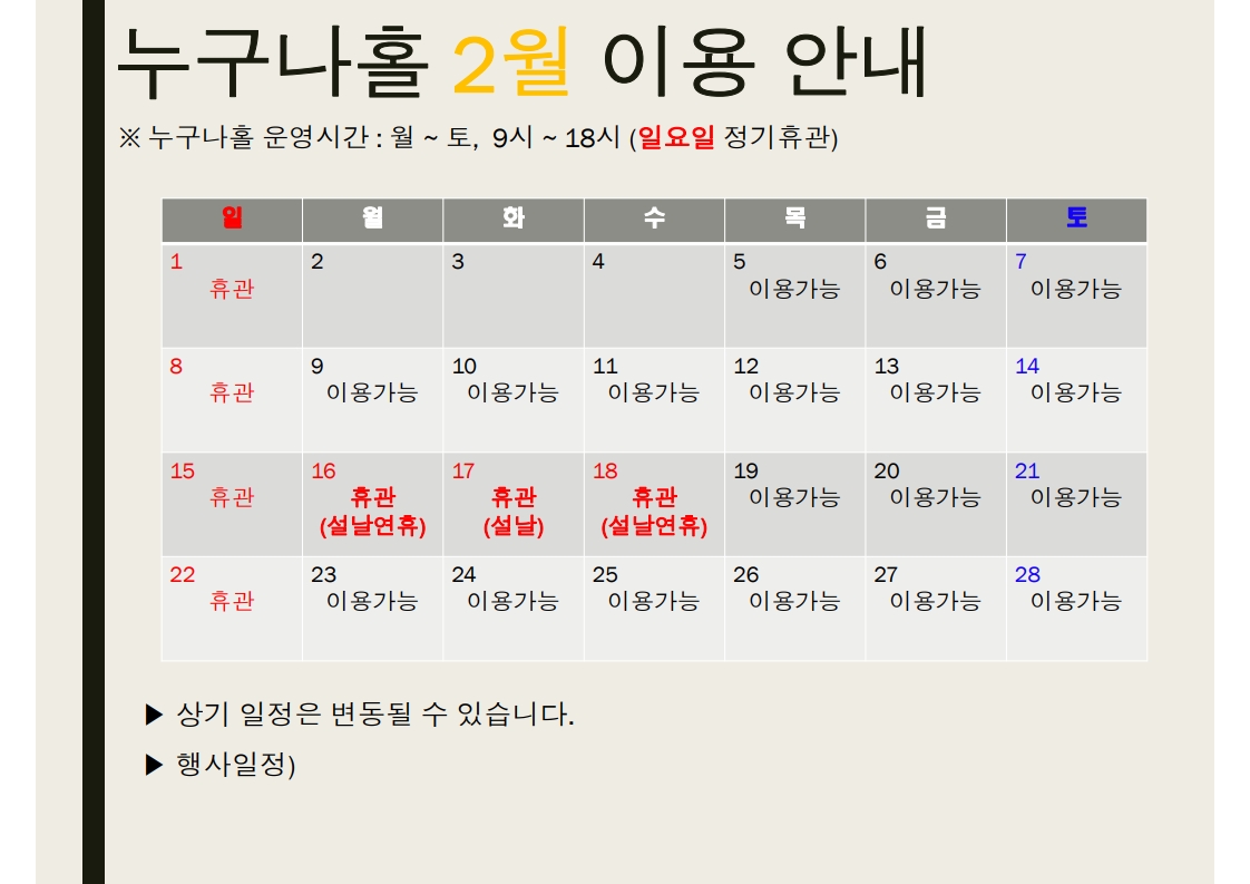 수원시 평생학습관 '누구나홀' 2월 이용 안내드립니다.