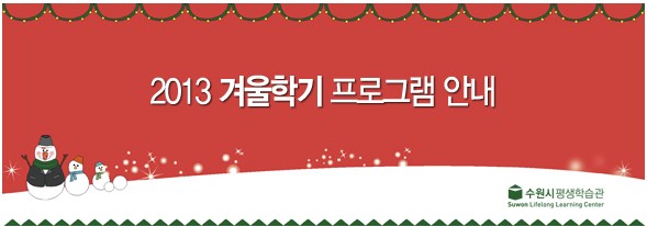 ★ 모집기간 2012년 12월 11일부터 모집시까지 ★ 신청방법 홈페이지 온라인 신청(https://learning.suwon.go.kr) 방문 신청(학습관 1층 상담실) ★ 상담전화 Tel 070-4477-6515~6 |