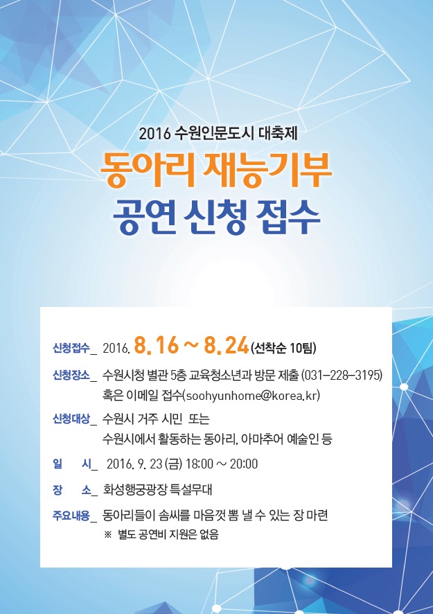2016 수원인문도시대축제에서 끼와 열정이 있는 시민의 참여를 기다리고 있습니다.
