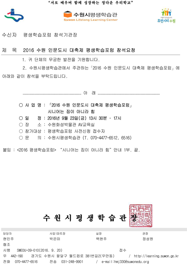[공지] 2016 평생학습포럼《시니어는 짐이 아니라 힘》공문 안내